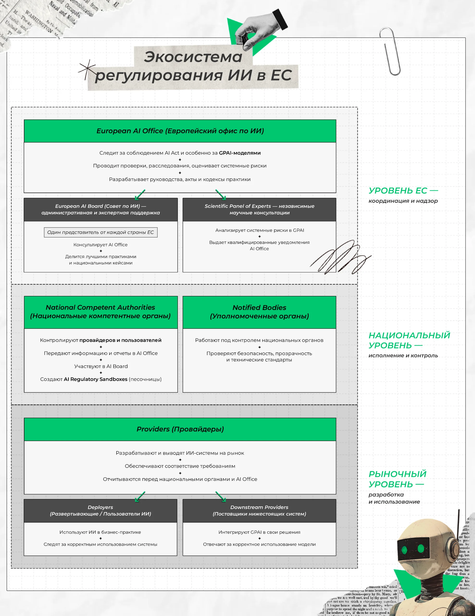 Перед тем, как углубиться в регулирование ИИ в ЕС, предлагаем посмотреть на эту схему. В ней мы собрали основные роли и уровни взаимодействия, чтобы вам было проще ориентироваться.