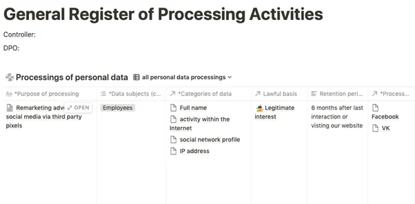 Реестр обработок данных (RoPA), который соответствует всем требованиям надзорных органов в применимых юрисдикциях. Он может быть использован всеми компаниями группы и легко масштабируется для включения новых юрисдикций и организаций. RoPA разработан как гибкая и легко обновляемая информационная система на платформе Notion.so. Остальные модули, необходимые для следующего этапа имплементации, также включены и интегрированы: